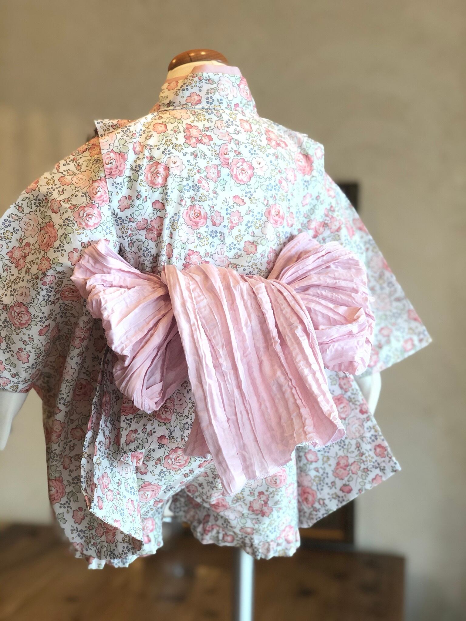 上衣は内側、外側のひもで結んで着せる仕立てです。肩上げ3センチ(全体で12センチ)ございますので、成長に合わせてご自身で調整していただけます。